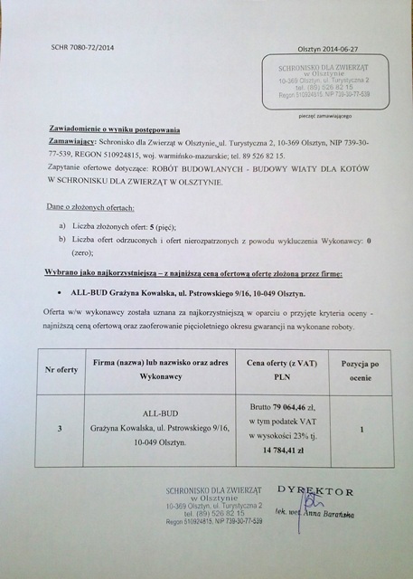 Poniżej umieszczone zostało zawiadomienie o wyniku postępowania.