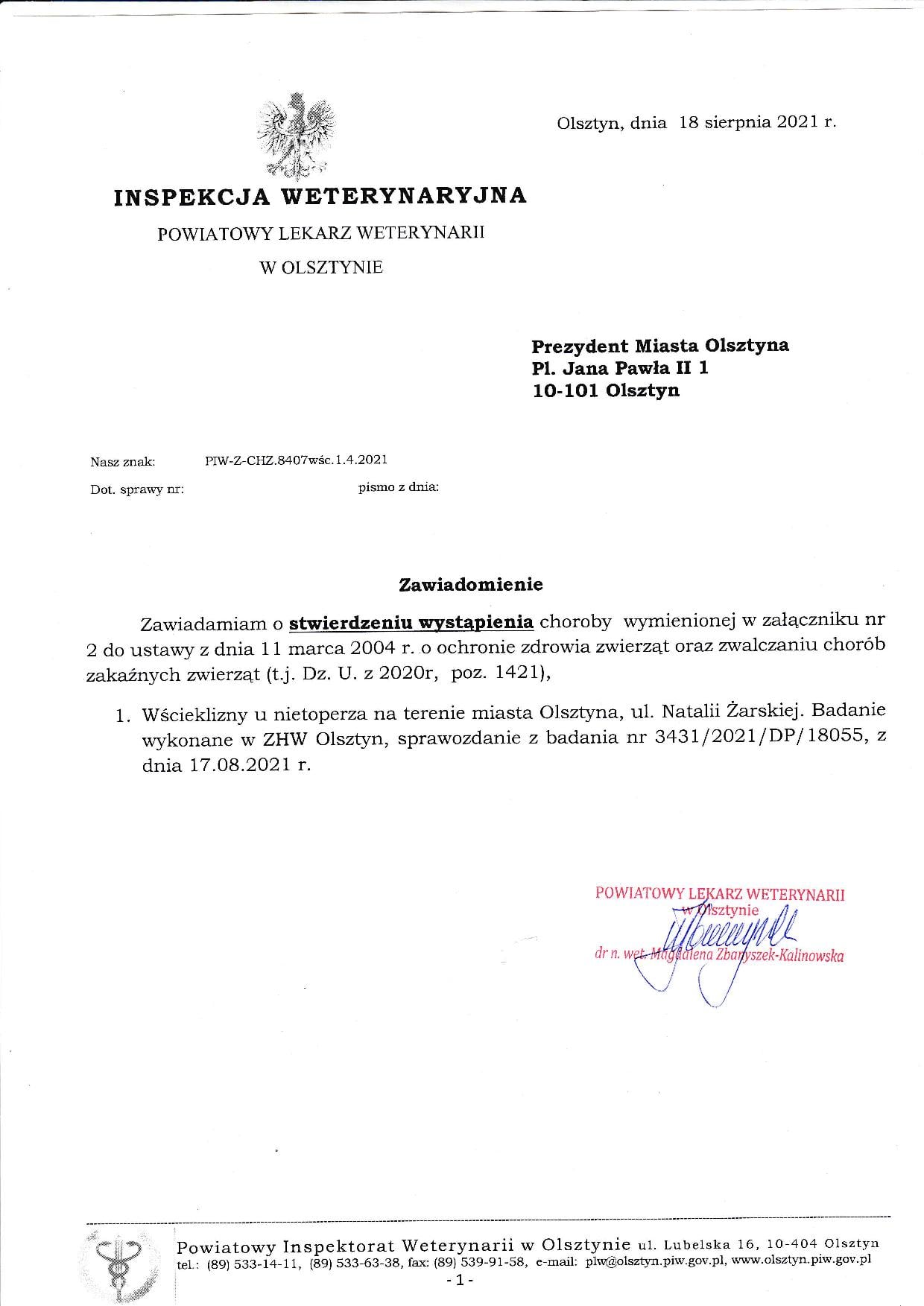 "W dniu 17.08.2021r. w badaniu laboratoryjnym przeprowadzonym przez ZHW Olsztyn stwierdzono wściekliznę u nietoperza, który został podjęty z ulicy Natalii Żarskiej w Olsztynie. W związku z zaistniałą sytuacją zostało wydane rozporządzenie w sprawie określenia obszaru zagrożonego wystąpieniem wścieklizny.