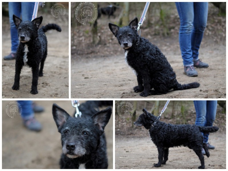Niemłody już (ale i nie stary jak na małego pieska), trafił z mieszkania w surowe, ciężkie dla domowych psów warunki. Okazał się tu pogodnym i bardzo przyjacielskim psiaczkiem, żyjącym w całkowitej zgodzie ze swoimi towarzyszami niedoli, bardzo kontaktowym, kochającym ludzi. Dino często porusza się na trzech łapkach - to efekt starego, zupełnie wyleczonego urazu łapki, biega na trzech łapkach jedynie nawykowo. Jest ładnym stworzeniem, ma kręconą sierść, poprzetykaną siwymi pasemkami, elegancki biały krawat, stojące uszka - oryginalny i nietypowej urody to chłopak, zwracający uwagę.